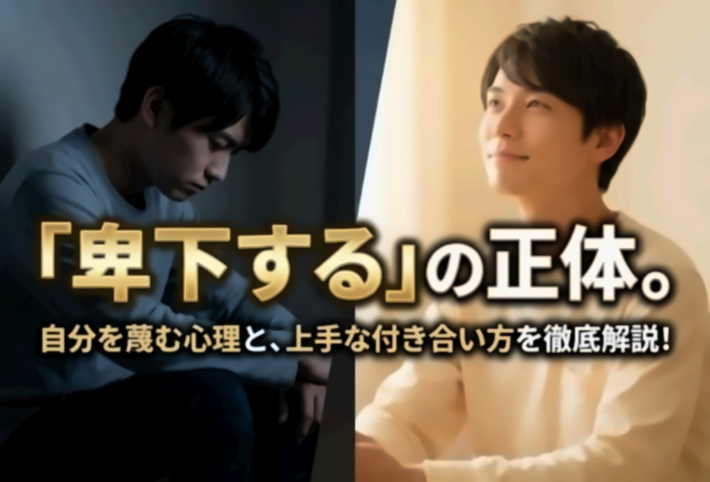 意味は、相手に対して必要以上にへりくだり、自分が劣っているように見せること。容姿、能力、仕事など、いろいろな要素に使います。また、他人が見下しているわけではなく、自分で自分を見下している状態のことを指します。