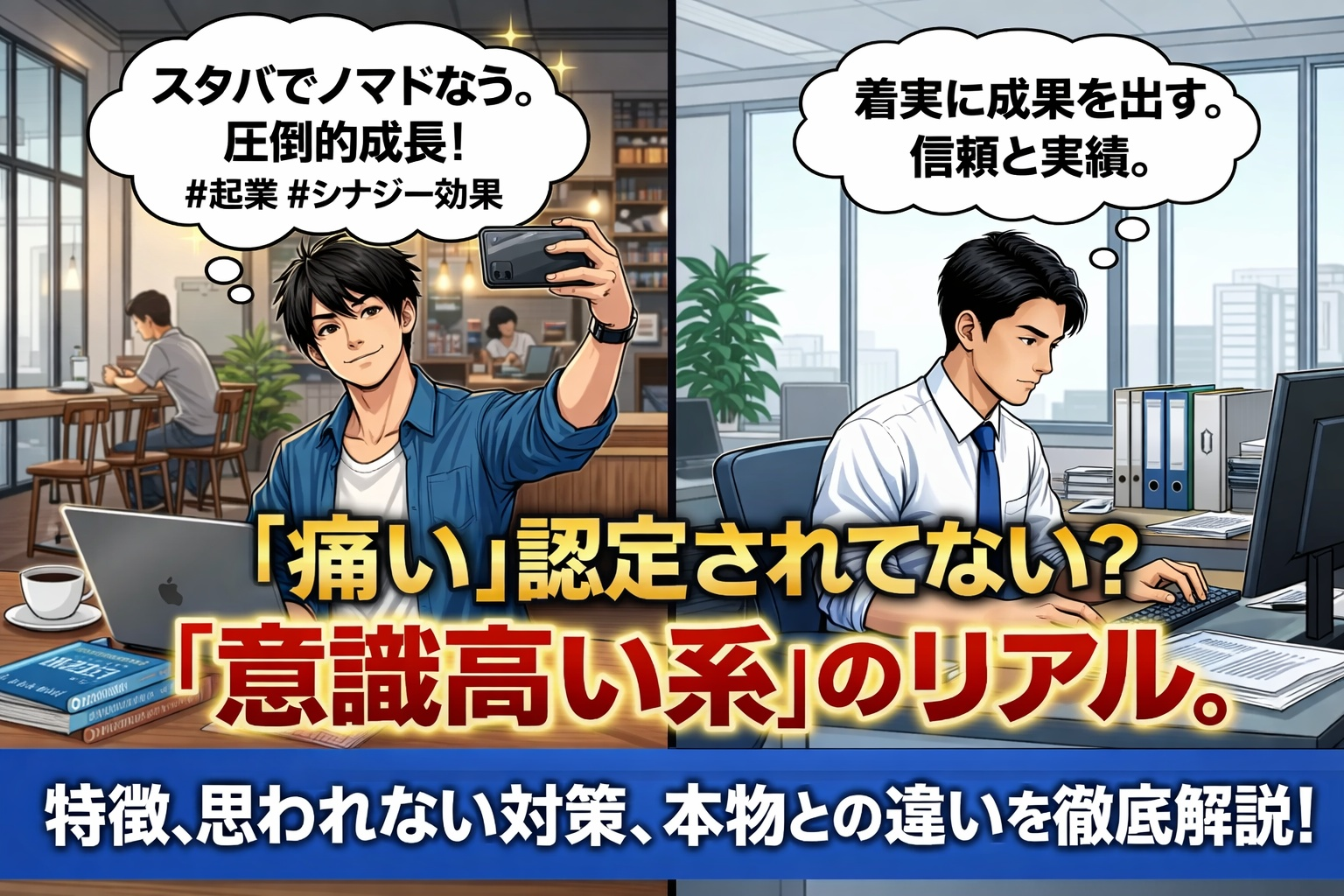 意識高い系の人は、ブランド物や難しいビジネス用語などで見栄を張って、人からの評価を上げようとしますが、意識高い人は人からの評価を気にしないのが大きな違い。