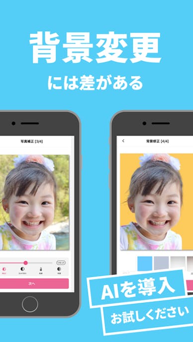 仕上げには[切り抜き]や[背景分離]で人物を抽出し、背景色を自由に選択できるため、証明写真用の雰囲気を手軽に演出可能。