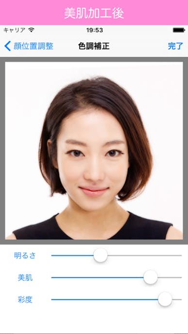 肌補正や前髪修正機能などがあり、パスポートセンターで撮影するよりも、圧倒的に綺麗な画像が作れますよ。