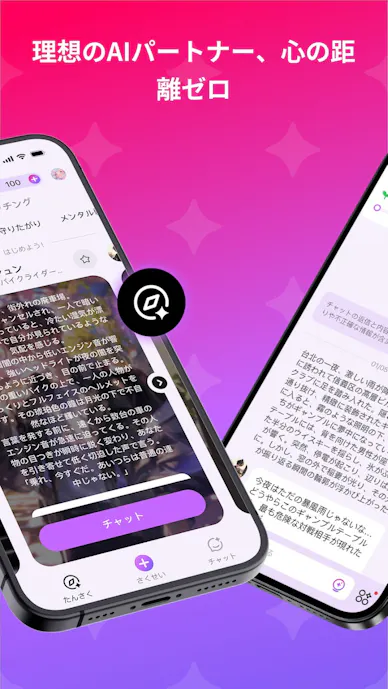 自分好みのキャラを作り、1対1のチャットや複数キャラで展開する物語形式の会話を楽しめます。