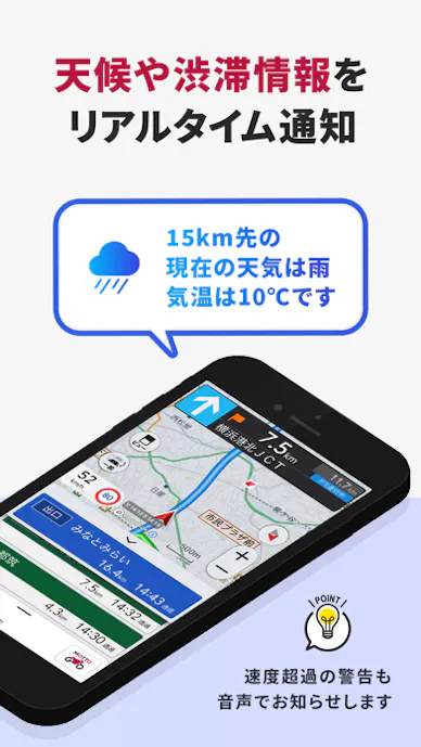 画面表示と音声アラートで知らせてくれるため、急な減速や違反リスクを最小限に抑えられます。