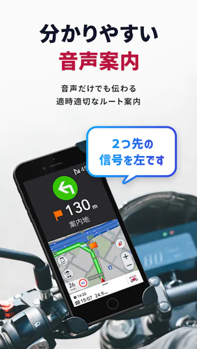 画面を見なくても音声案内がバックグラウンドで流れるため、ヘルメット着用中でも安心。道幅の広い道路を優先し、分岐点はイラストでわかりやすく表示されます。