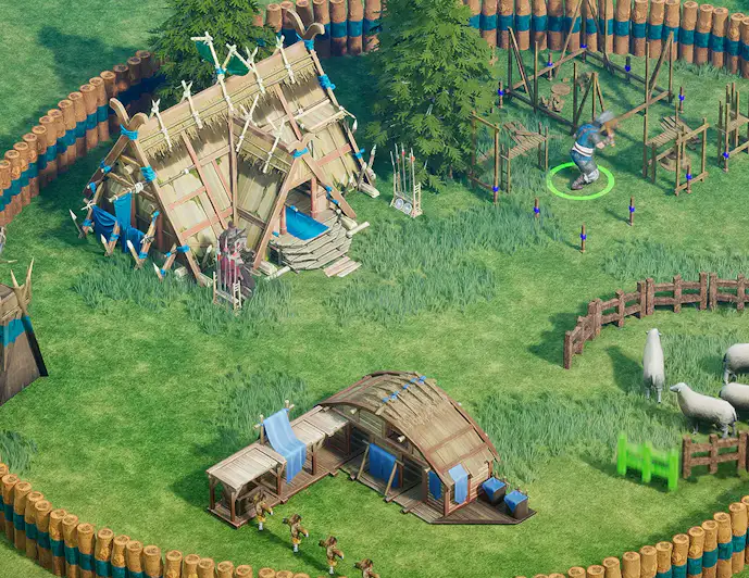 伐採所や農場で資源を生み出し、住宅や市場、噴水広場などの施設を好きな場所へ配置可能。