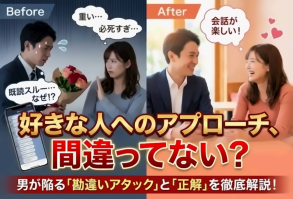好きな人への的確なアプローチ方法は「相手の女性と今どのフェーズの関係にいるのか?」を見極めて、パターン別に「自分はどの言動をすればいいのか」を使い分けること。間違ったアプローチをすると、好きな人と付き合うことができないどころか、嫌われてしまいます。