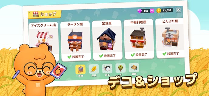 かわいいデコを配置して農園を整える楽しさがあり、どうぶつの森のような箱庭感覚を味わえますよ。