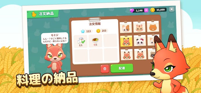 料理を手作りしてデリバリーし、集めたコインで新しいデコを購入して、農場を少しずつ整えていきます。
